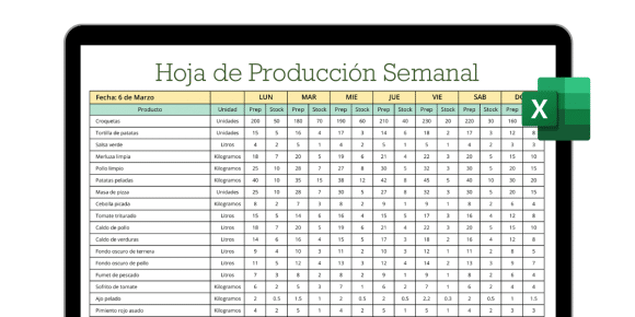 La Hoja de producción semanal en Excel está pensada para cocinas que necesitan planificar con antelación lo que se va a preparar cada día de la semana. Con esta herramienta podrás tener una visión clara de toda la semana: qué productos necesitas, cuánto stock tienes y cuánto debes preparar. Así evitas hacer todo a última hora, puedes coordinar mejor a tu equipo y tirar menos comida a la basura.
