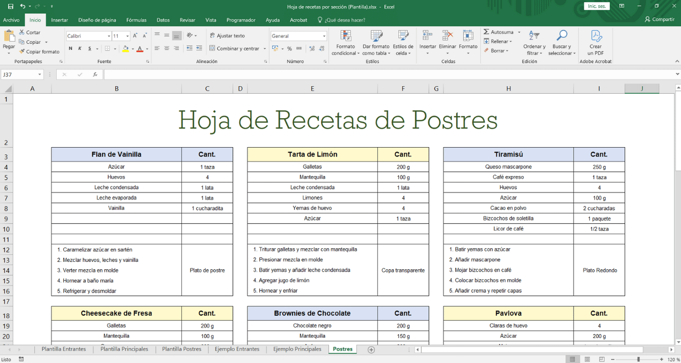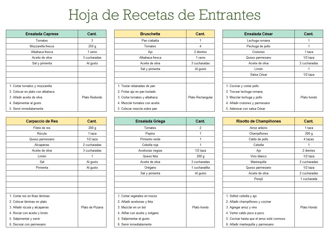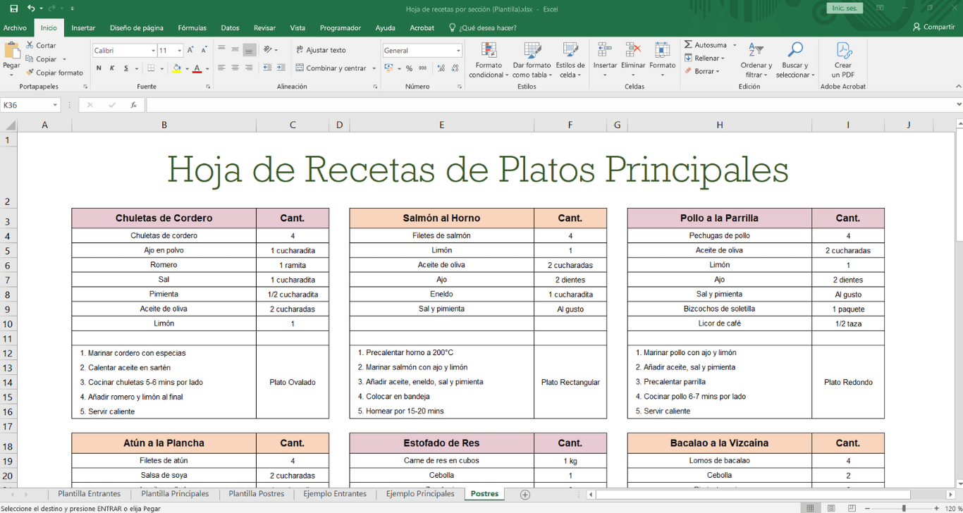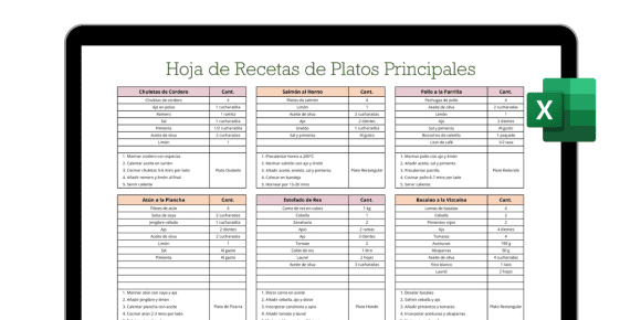 Hoja de recetas por sección