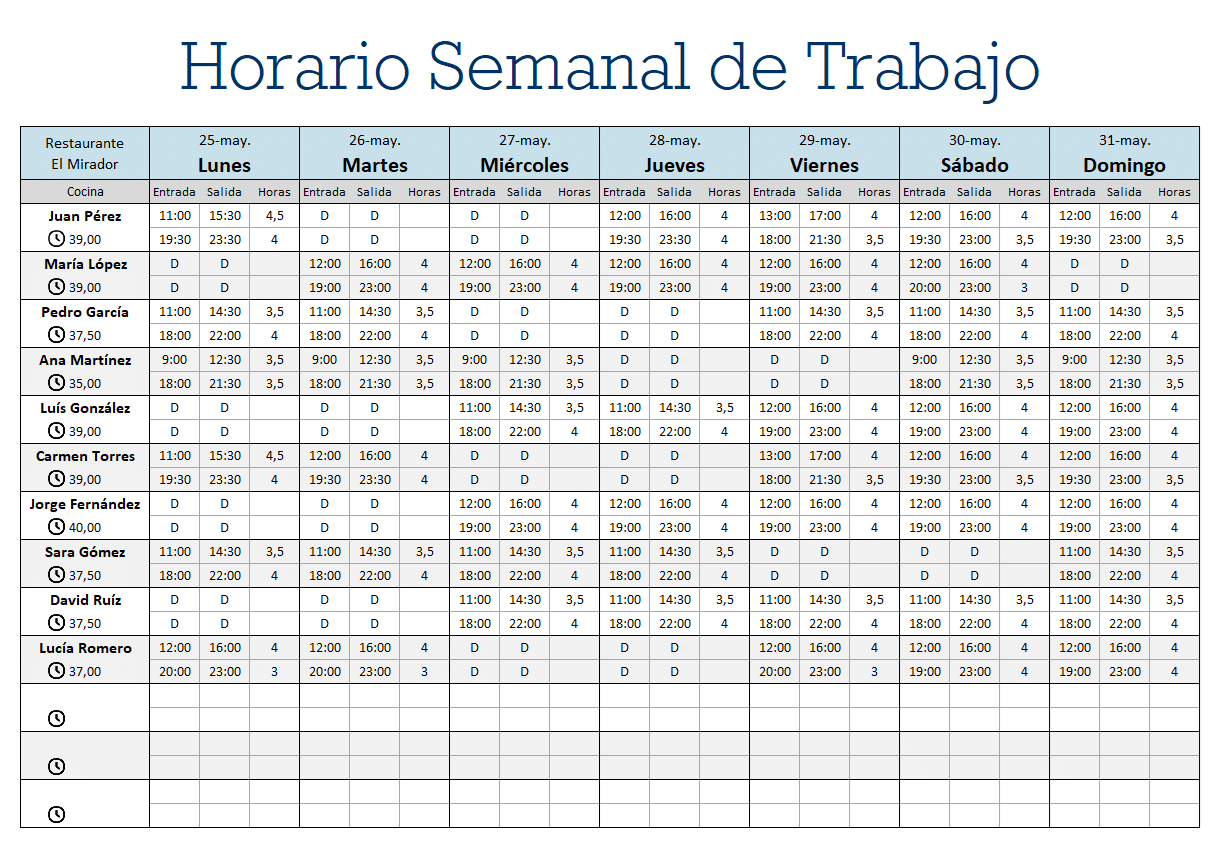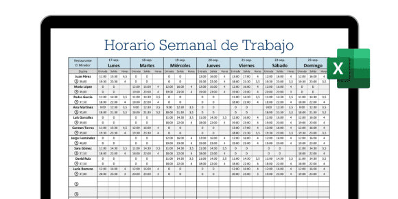 Para jefes de cocina, encargados de sala, gerentes de restaurantes. Si estás cansado de rehacer horarios o de perder tiempo sumando horas, esta plantilla es lo que buscabas.