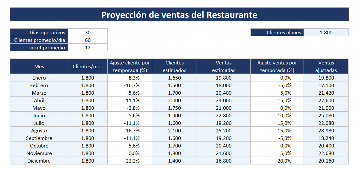 - Ajuste de clientes por temporada: puedes marcar si en algún mes esperas más o menos gente de lo habitual.