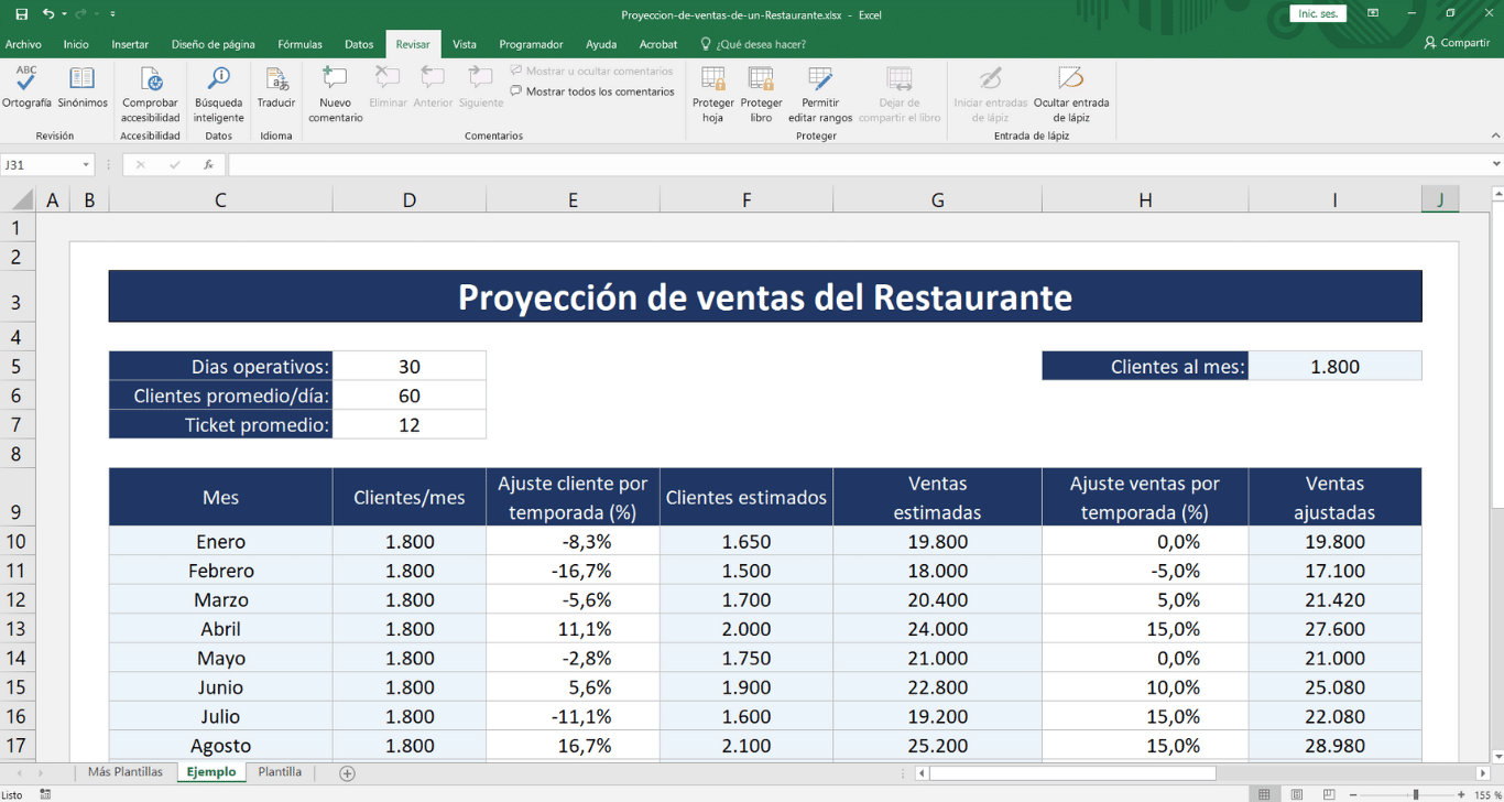 Con nuestra plantilla de Proyección de ventas para restaurantes en Excel tendrás una herramienta gratis que te ayudará a calcular mes a mes cómo podrían moverse tus ventas, tomando en cuenta los cambios en la cantidad de clientes según la época del año. Así podrás organizar mejor tu trabajo y prepararte con tiempo.